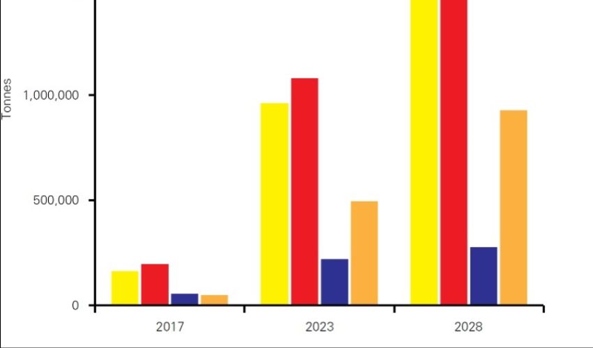 Nel grafico qui sotto uno studio sul potenziale aumento della richiesta di materie prime: in rosso la grafite, in giallo il litio, in arancio il nickel e in blu il cobalto